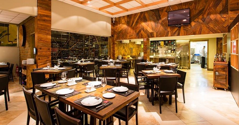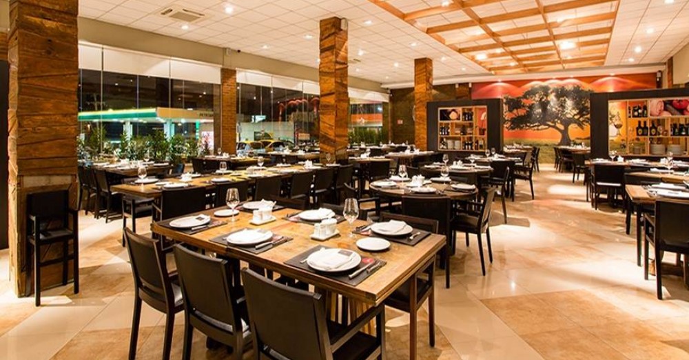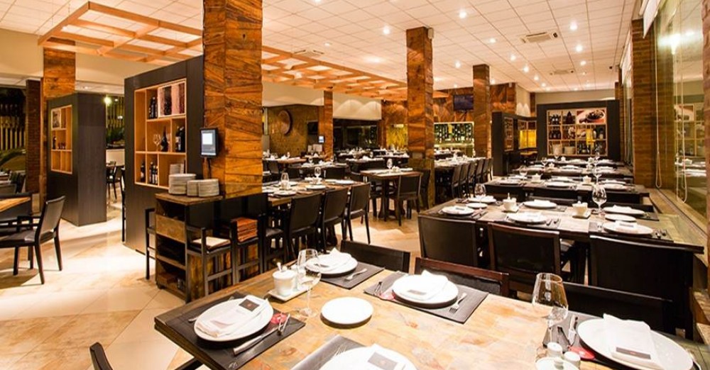 Churrascaria gourmet de alto padrão com decoração sofisticada e seleção de carnes nobres e vinhos. -